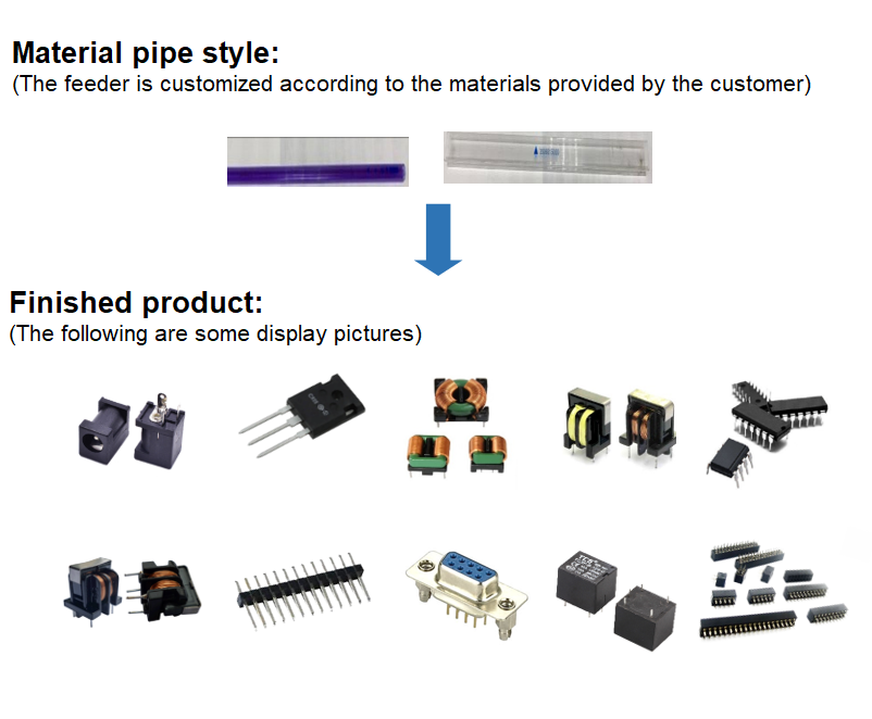 The tubular feeder is a tubular electronic component supply device that supplies tube-mounted electronic components to the insertion machine one by one at a specified time through vibration and air blowing.